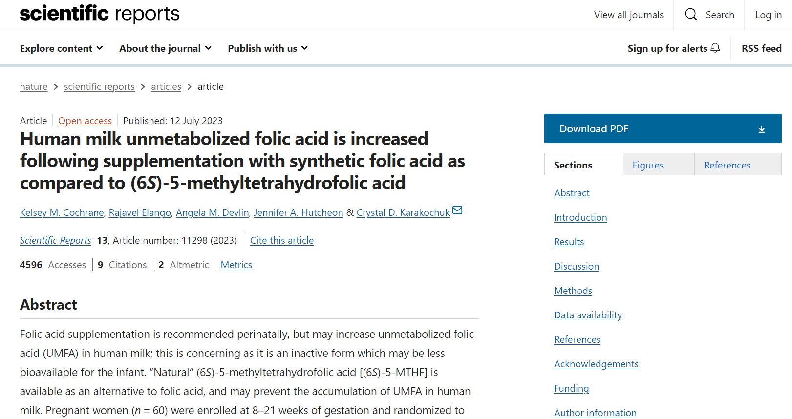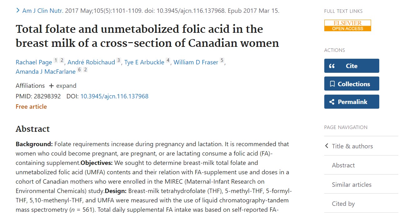 पेज आर एट अल. कनाडाई महिलाओं के स्तन के दूध में कुल फोलेट और अनमेटाबोलाइज्ड फोलिक एसिड। एम जे क्लिन न्यूट्र 2017;105:1101-9।