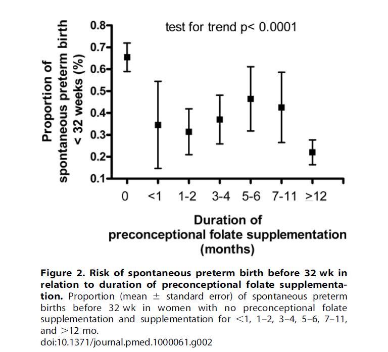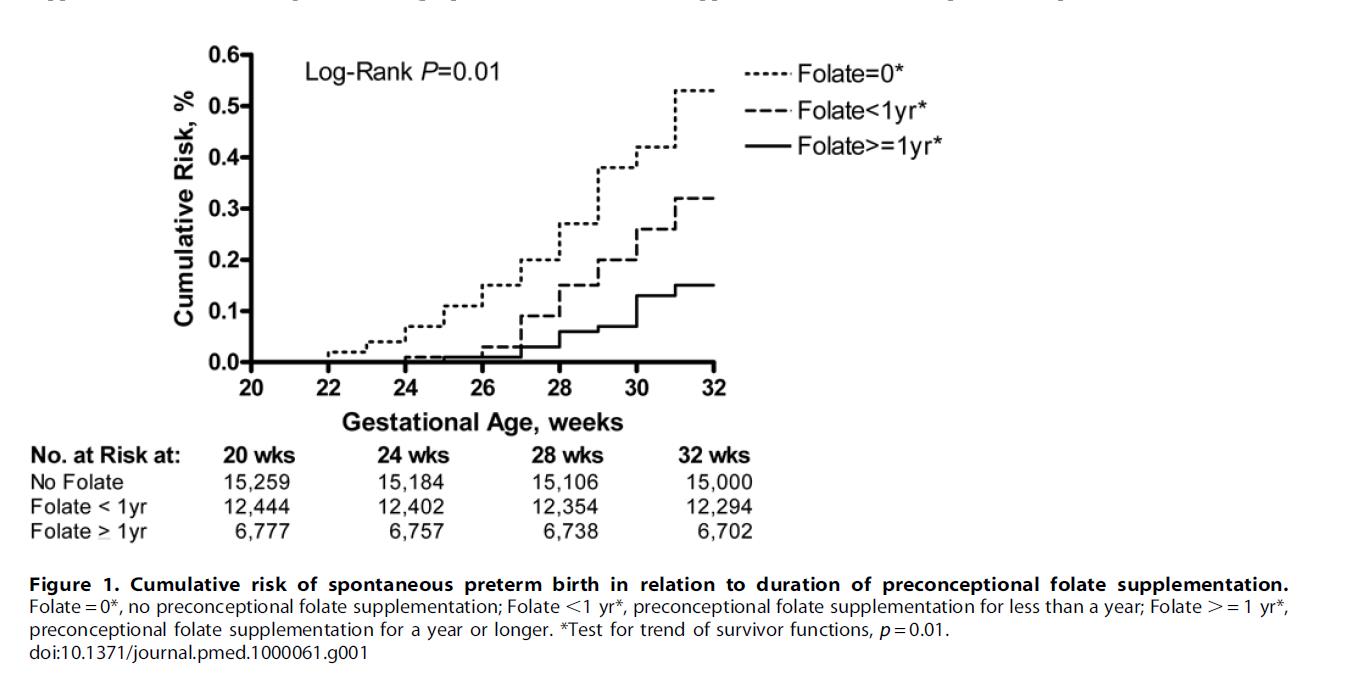 के बीच लगभग कोई अंतर नहीं था तीन समूह. यह इंगित करता है कि फोलेट केवल "बहुत जल्दी समय से पहले जन्म" को रोकता है जन्म" और पूर्ण अवधि के करीब समय से पहले जन्म पर इसका कोई प्रभाव नहीं पड़ता है।