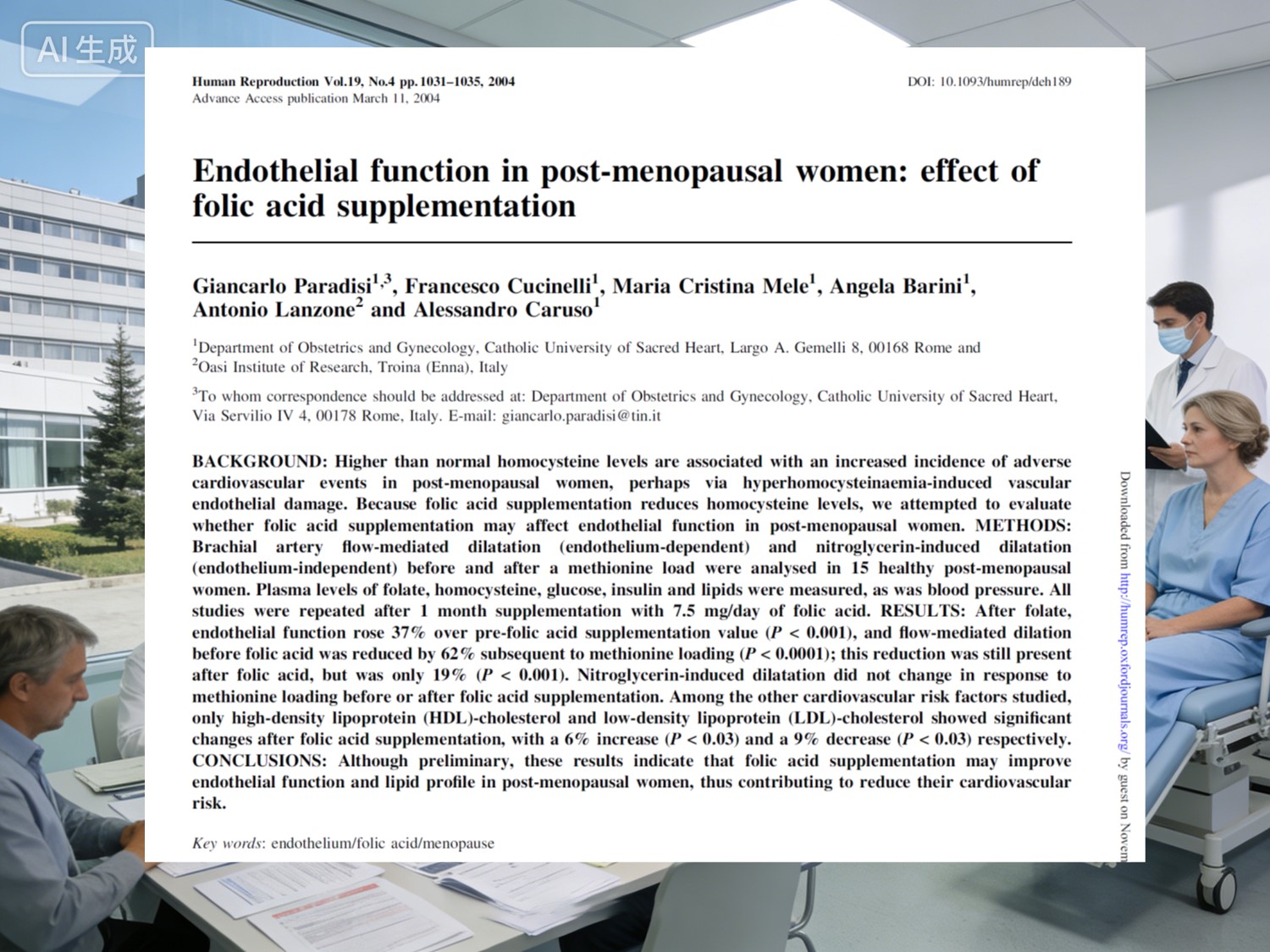 ए लैंडमार्क 2004 का अध्ययन प्रकाशित हुआ मानव प्रजनन (आईएफ 6.1) द्वारा जियानकार्लो पारादीसी, फ्रांसेस्को कुसीनेली और सहकर्मियों ने विशेष रूप से ध्यान केंद्रित किया रजोनिवृत्ति उपरांत महिलाएं. पंद्रह स्वस्थ प्रतिभागी, विशिष्ट के प्रतिनिधि रजोनिवृत्ति के बाद की स्थिति, 7.5 ली गई मिलीग्राम/दिन का एक महीने के लिए फोलिक एसिड. परिणामों में उल्लेखनीय सुधार दिखे: