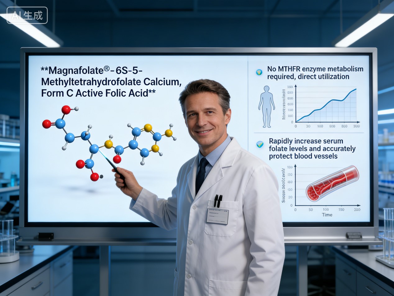 मैग्नाफोलेट®, ए 6S-5-मिथाइलटेट्राहाइड्रोफोलेट कैल्शियम (क्रिस्टलीय एक्टिव फोलेट), इसे पूरा करता है मुख्य नैदानिक आवश्यकता. स्वाभाविक रूप से सक्रिय फोलेट के रूप में, इसकी आवश्यकता होती है कोई MTHFR एंजाइम नहीं चयापचय और तत्काल उपयोग के लिए तैयार शरीर में प्रवेश करता है, इसे साफ़ करने के लिए तेजी से एचसीवाई ब्रेकडाउन पाथवे में शामिल हो रहे हैं“चुप अपघर्षक”जहाजों का. यह सीरम फोलेट को तेजी से बढ़ाता है स्तर, समय पर, लक्षित संवहनी सुरक्षा को सक्षम करने के लिए बिल्कुल उपयुक्त है रजोनिवृत्ति के बाद एंजाइमेटिक परिवर्तन, जिससे समाप्त हो जाता है“पूरक लेकिन अवशोषित नहीं”संकट।