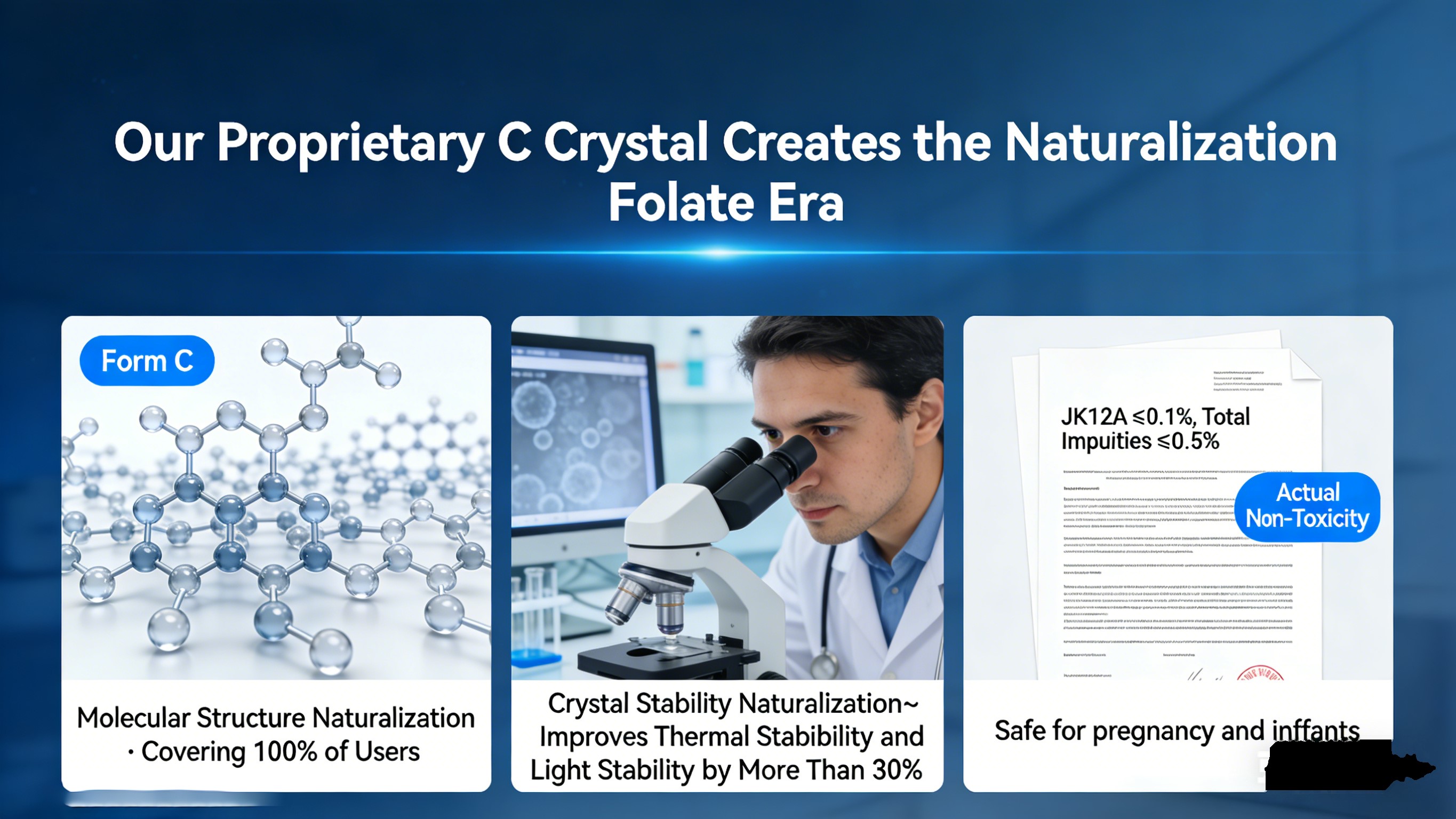 मालिकाना सी-क्रिस्टल प्राकृतिकीकरण फोलेट: हमारा विश्व स्तर पर पेटेंट कराया गया सक्रिय फोलेट का क्रिस्टल रूप और दुनिया का पहला प्राकृतिकीकरण फोलेट श्रेणी. सुरक्षा खाद्य-व्युत्पन्न फोलेट के करीब पहुंचती है। पर स्थिर रहता है कमरे का तापमान और गर्भावस्था-शिशु ग्रेड गुणवत्ता नियंत्रण से कहीं अधिक मिलता है घरेलू और अंतर्राष्ट्रीय फार्माकोपिया। में नवीनतम उन्नयन का प्रतिनिधित्व करता है फोलेट प्रौद्योगिकी.
