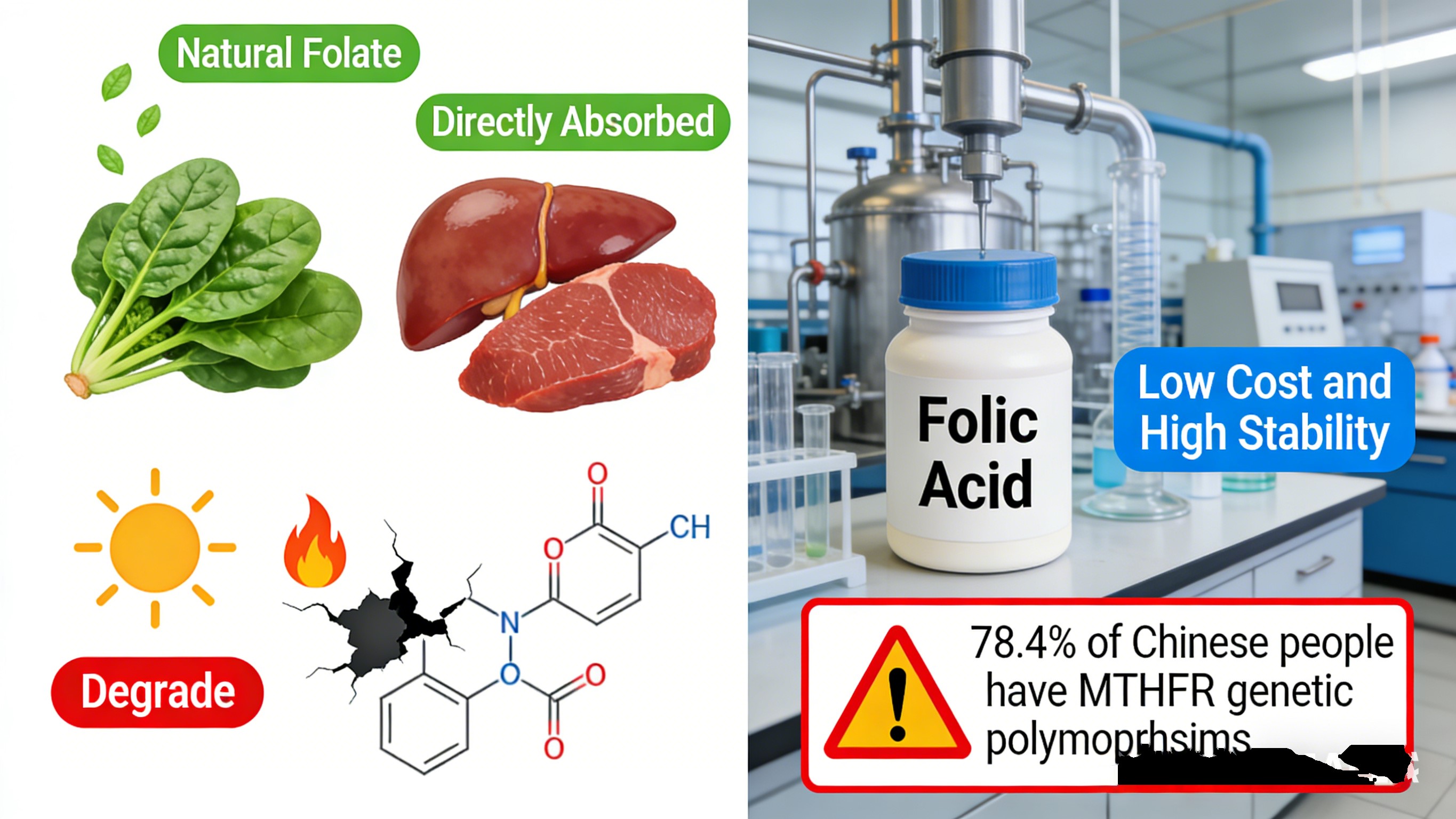 फिर भी चल रहे नैदानिक और पोषण अनुसंधान से पता चला यह अकिलीज़ हील है: फोलिक एसिड में आंतरिक शारीरिक गतिविधि का अभाव है और होना ही चाहिए अवशोषण योग्य बनने के लिए चार एंजाइमेटिक चरणों से गुज़रें। आर एंड डी शो में मेरे 19 साल चीन में वास्तविक दुनिया पर प्रभाव: 78% आबादी में एमटीएचएफआर जीन दिखता है बहुरूपता, जिसमें 28% गंभीर चयापचय हानि - एंजाइम गतिविधि शामिल हैं जंगली प्रकार के व्यक्तियों की संख्या कम से कम 30% है।