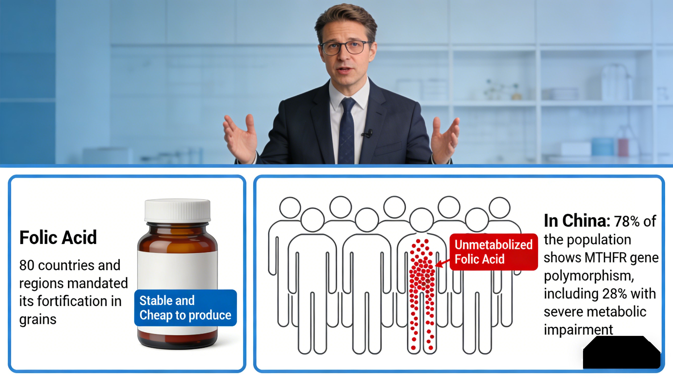 व्यावहारिक रूप से, लगभग 30% चीनी लोग फोलिक एसिड को कुशलता से परिवर्तित नहीं कर सकता, जिससे अनुपूरण अप्रभावी हो जाता है और अनमेटाबोलाइज्ड फोलिक एसिड का संभावित निर्माण, जो विटामिन बी12 की कमी को पूरा कर सकता है और जिंक अवशोषण में बाधा डालते हैं। कंपनियों के लिए, इसका अनुवाद होता है उपभोक्ता शिकायतें और प्रतिष्ठा जोखिम।