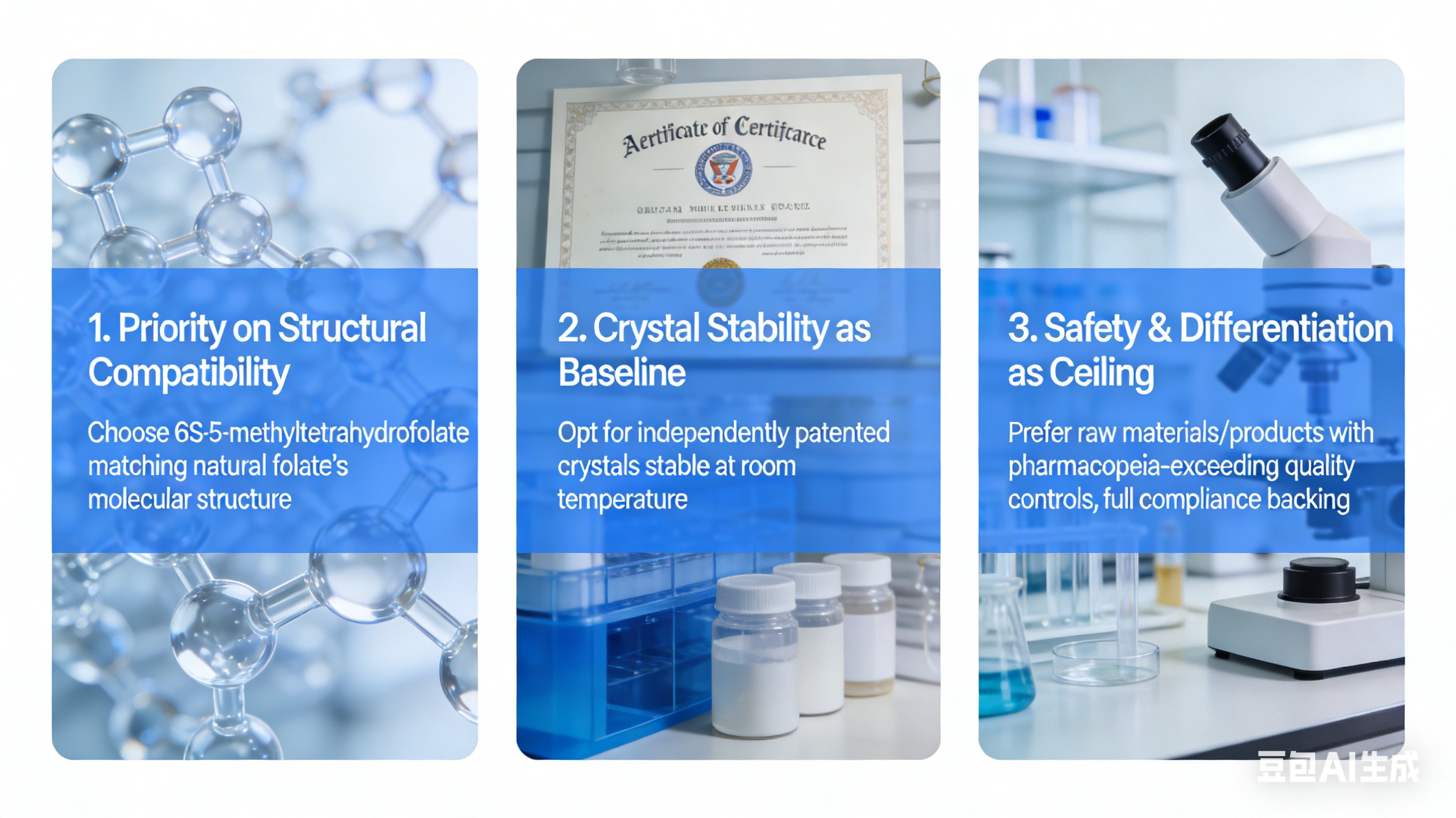 1. संरचनात्मक अनुकूलता को प्राथमिकता: 6S-5-मिथाइलटेट्राहाइड्रोफोलेट मिलान चुनें प्राकृतिक फोलेट की आणविक संरचना - प्रत्यक्ष अवशोषण, सभी को कवर करता है उपयोगकर्ता, अप्रभावीता को रोकता है।2. आधार रेखा के रूप में क्रिस्टल स्थिरता: स्वतंत्र रूप से पेटेंट किए गए स्थिर क्रिस्टल का विकल्प चुनें बैच की स्थिरता और लेबल का दावा सुनिश्चित करने के लिए कमरे के तापमान पर अनुपालन.